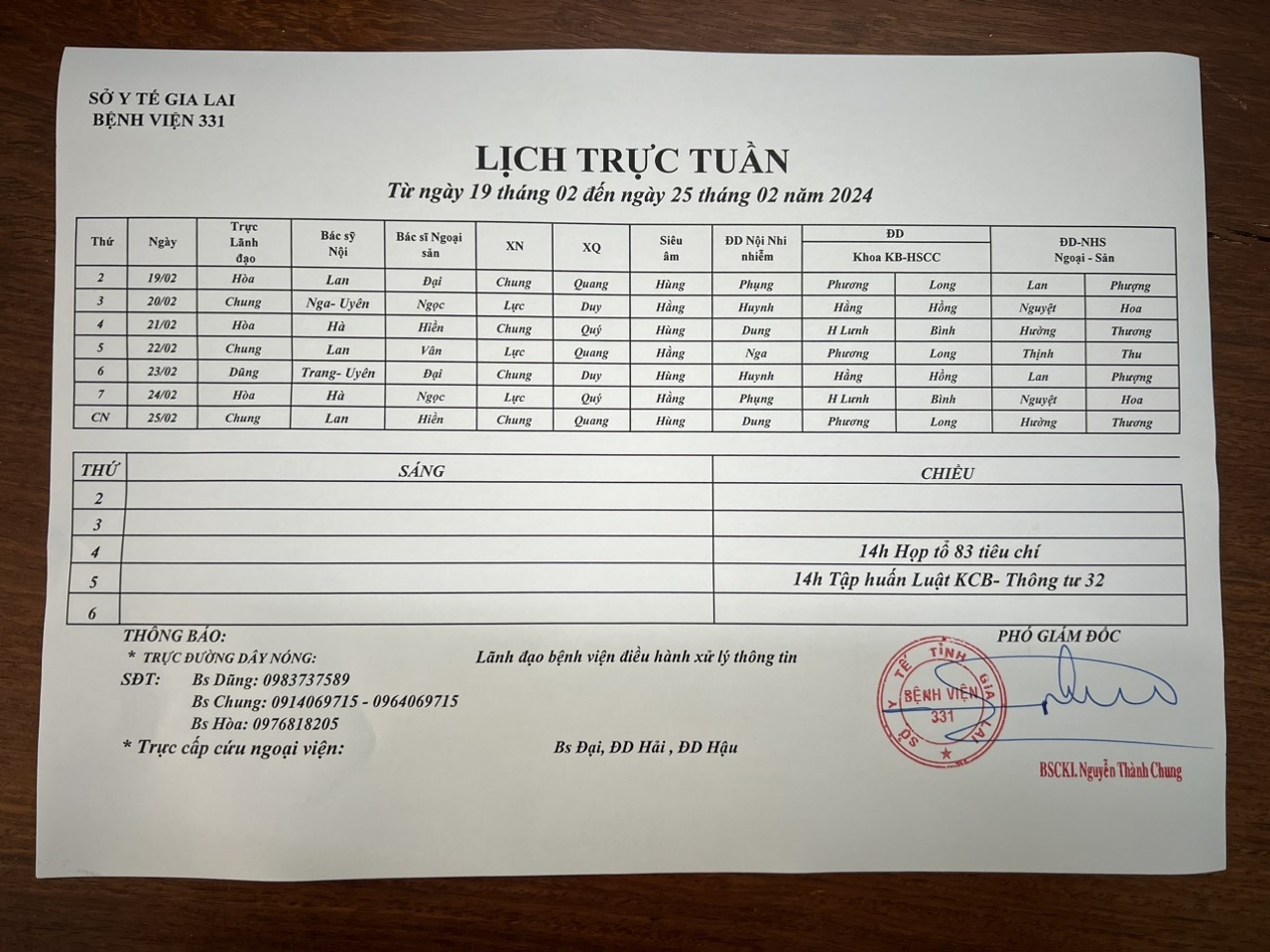 Lịch trực Bệnh viện 331 từ ngày 19/02 đến ngày 25/02 năm 2024