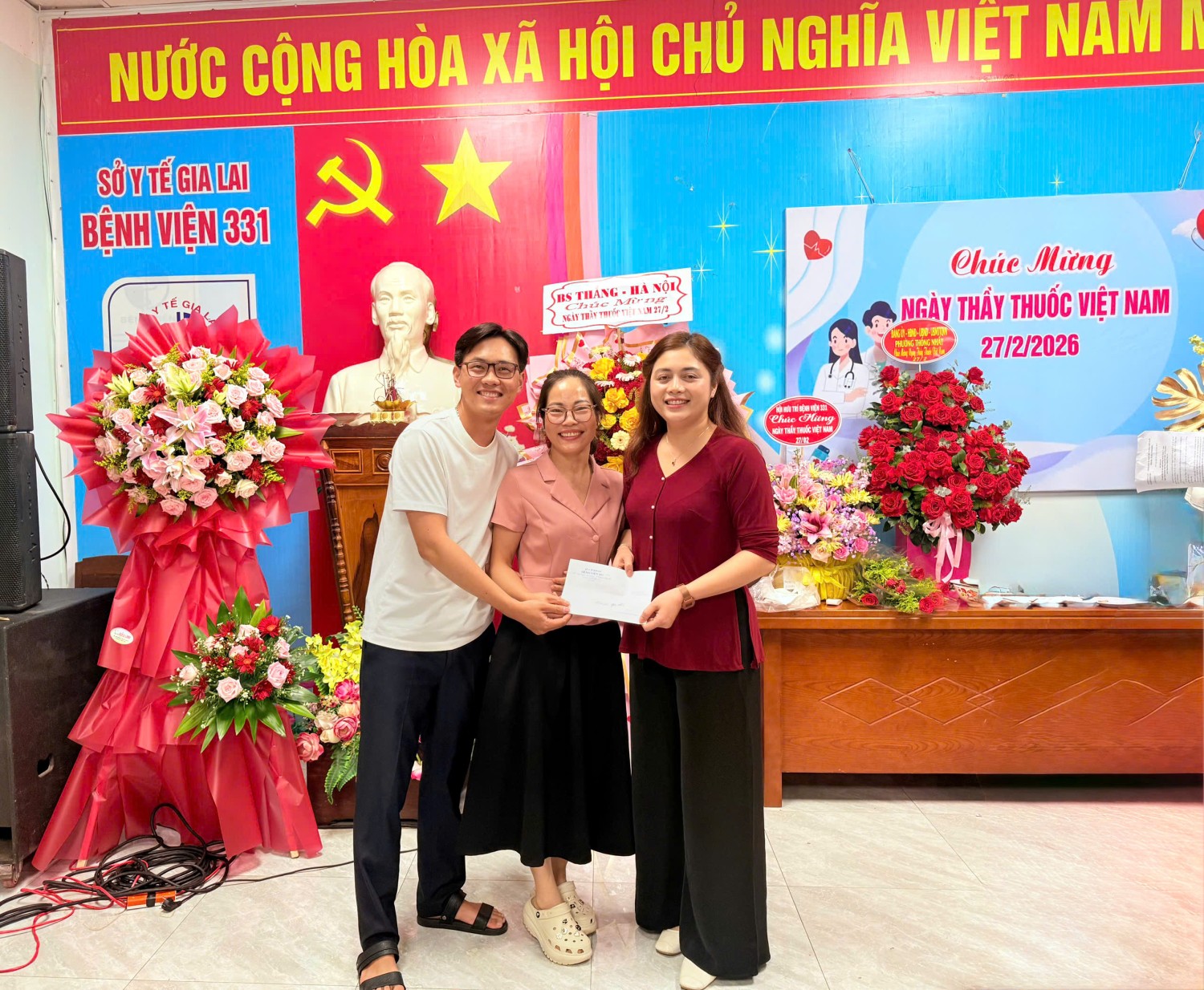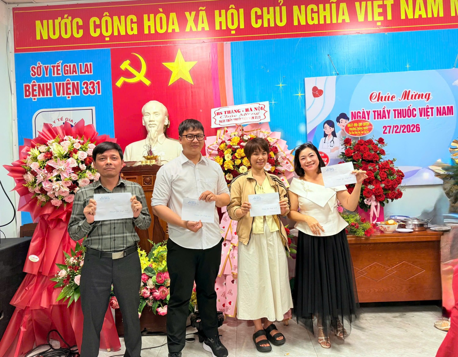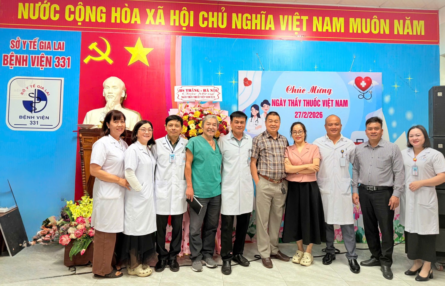 Tham dự chương trình có Ban Giám đốc bệnh viện, lãnh đạo các khoa, phòng cùng đông đảo cán bộ, viên chức, người lao động đang công tác tại đơn vị. Đặc biệt trân trọng cảm ơn sự tham gia của lãnh đạo Sở Y tế tỉnh Gia Lai; UBND phường Thống Nhất, hội Hưu trí Bệnh viện 331, các cơ quan, doanh nghiệp… đã dành thời gian đến thăm, động viên đội ngũ thầy thuốc của bệnh viện, cùng những lẵng hoa tươi thắm và những lời chúc mừng tốt đẹp.